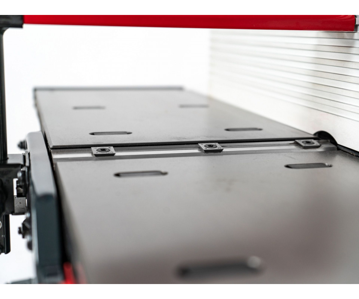 El tope angular orientable permite trabajar cantos con total precisión desde 90° hasta 45°. La longitud total de las mesas de fundición es de 770 mm, ampliable hasta 1.350 mm mediante extensiones integradas, ofreciendo una amplia superficie de apoyo sin renunciar a un diseño compacto y fácil de ubicar en cualquier taller.