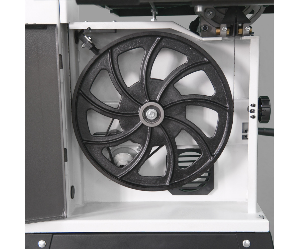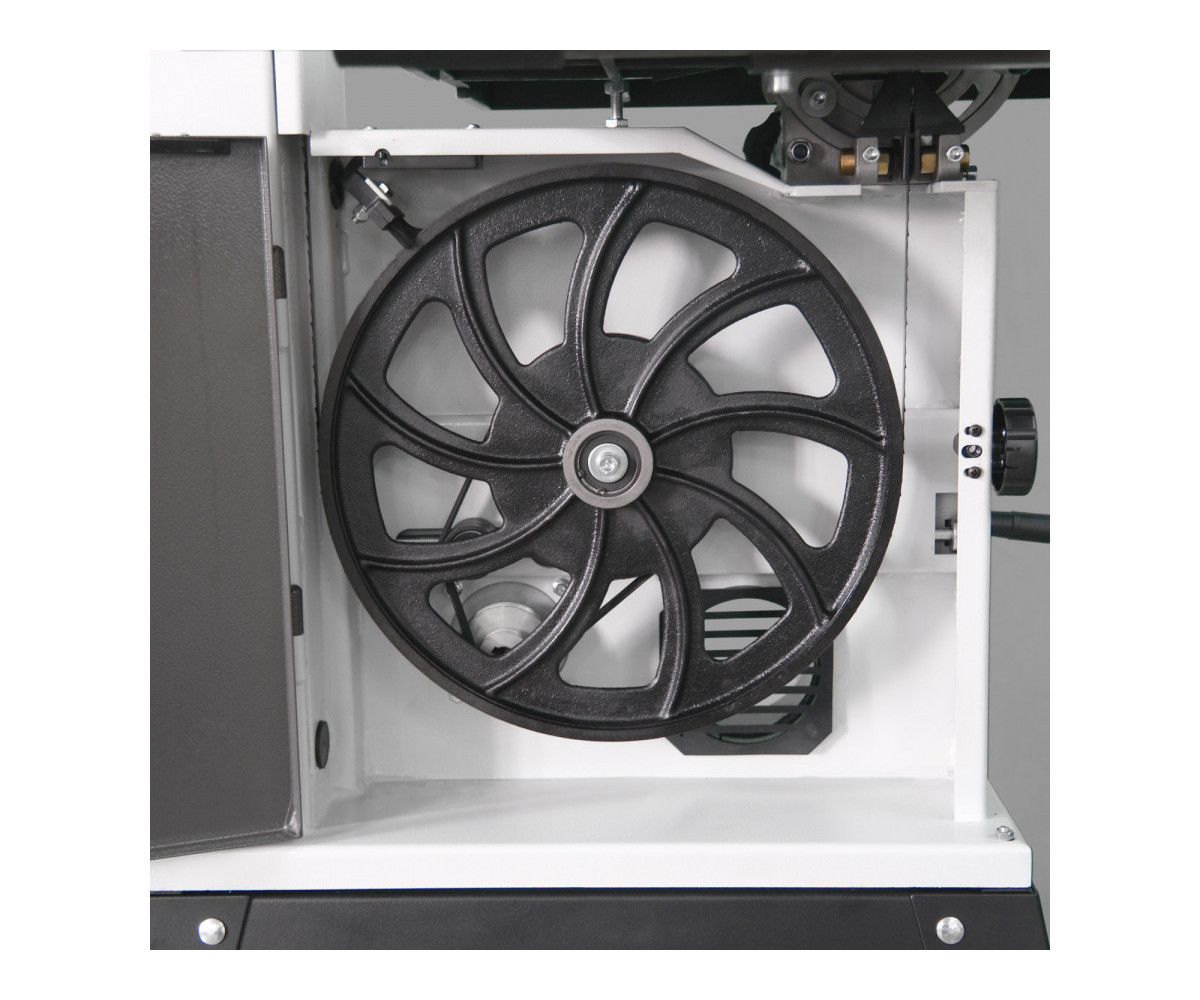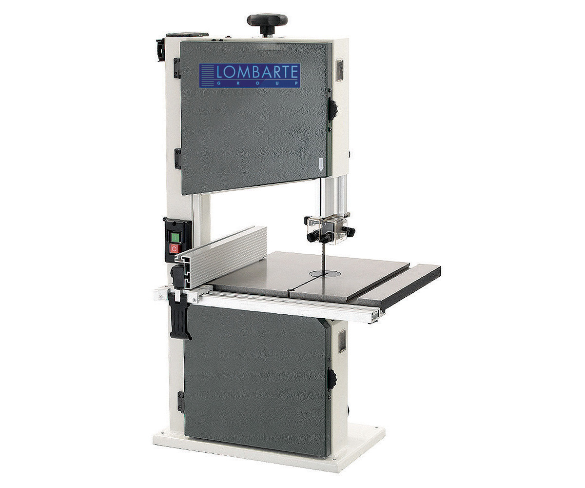 Sierra de cinta con volantes de 250 mm, guía paralela, volantes radio en fundición. Maneta de cambio rápido de cinta. Motor 0,5 cv.