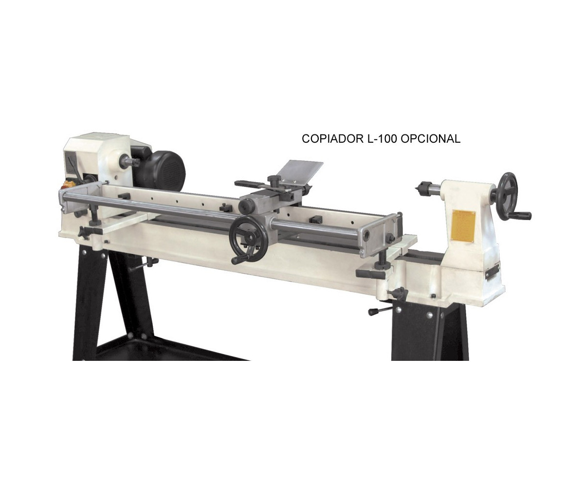 Torno para madera integramente fabricado en fundición. Cabezal pivotante para tornear al aire. Variador de velocidad cmecánico. Permite adaptar copiador modelo L100. TORNO PARA ARTESANOS.